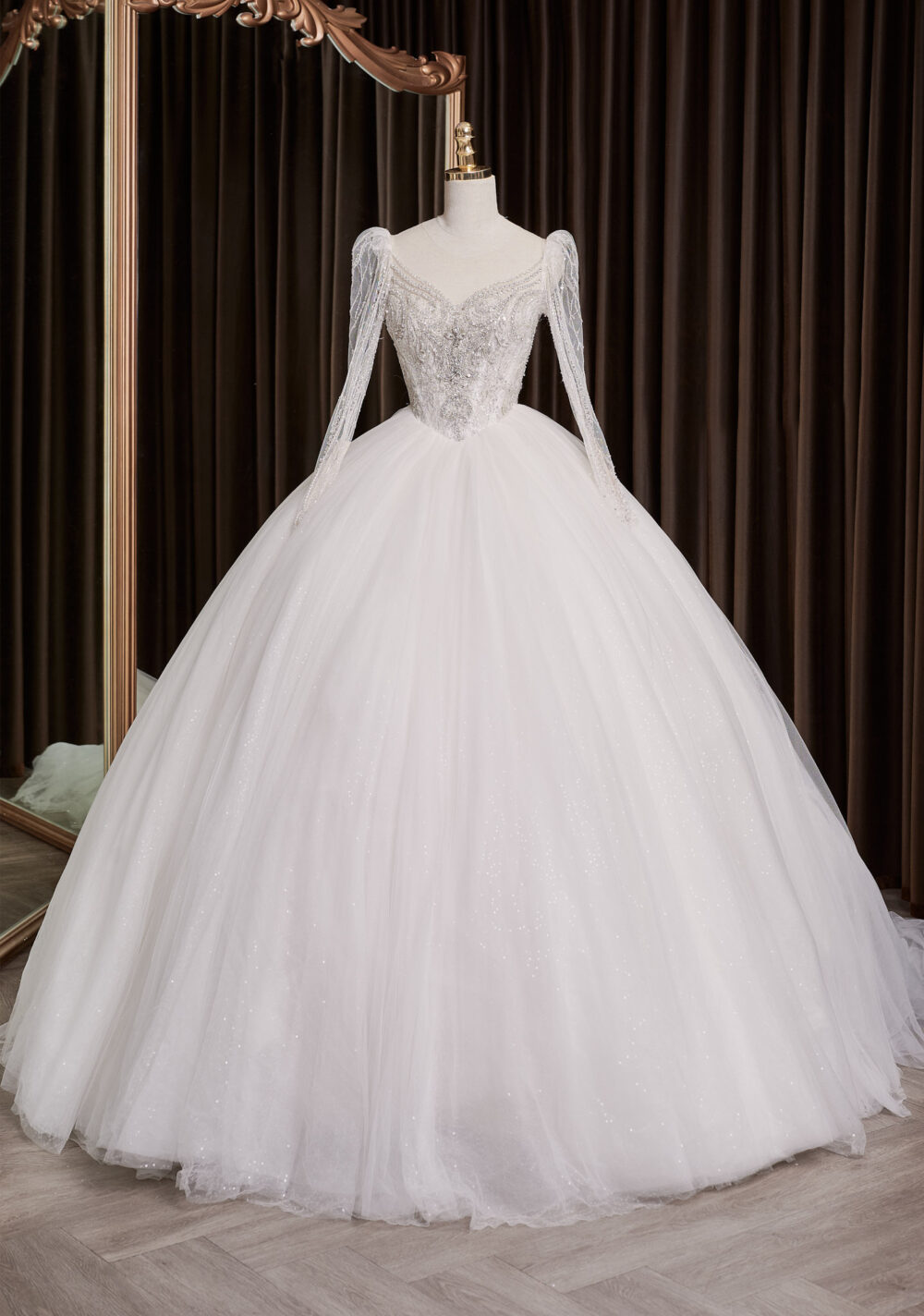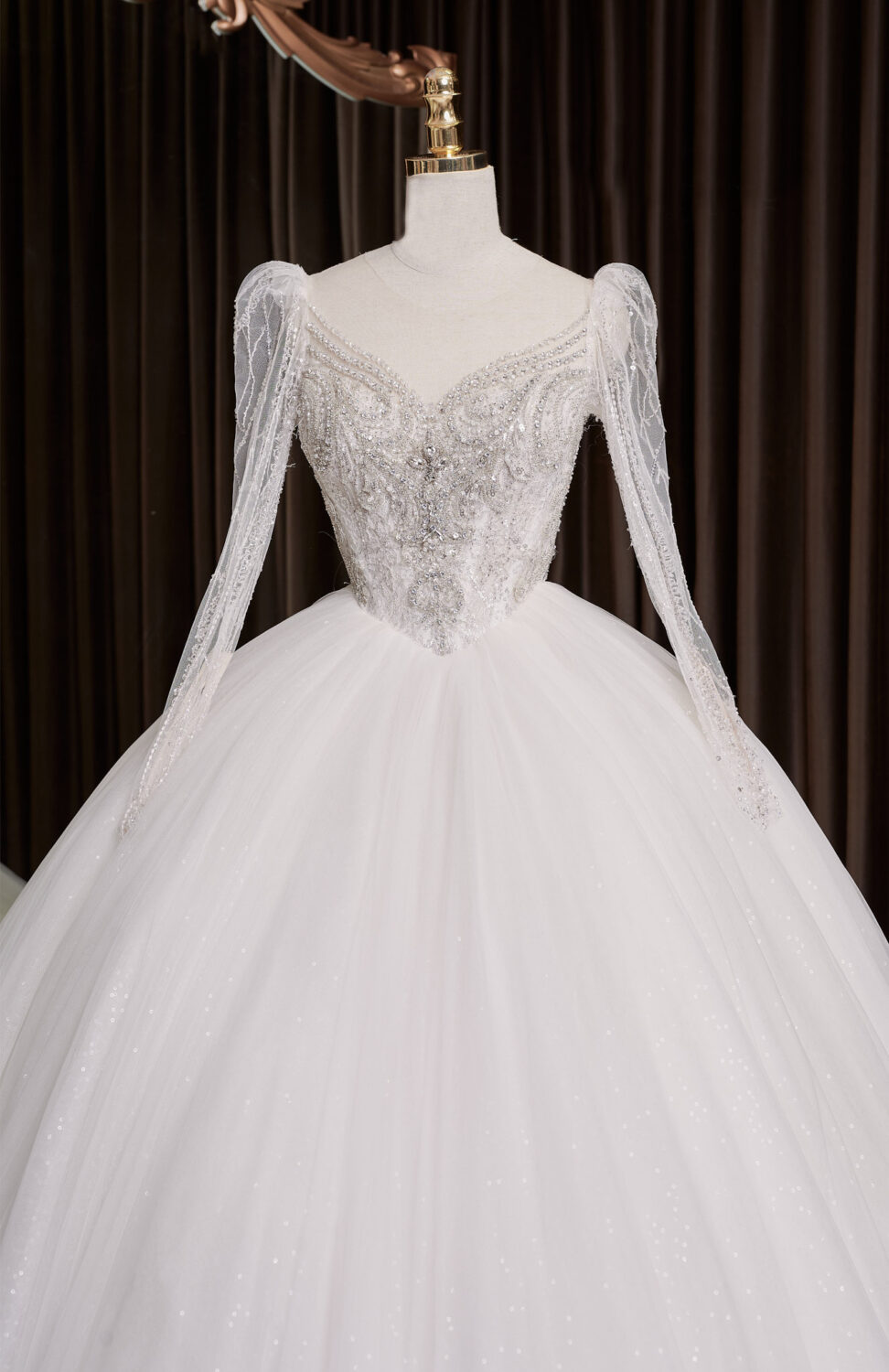 - Tay dài có đô giúng nhẹ: Mẫu tay phù hợp cho các cô dâu có vai hẹp, khuyết điểm ở bắp tay.