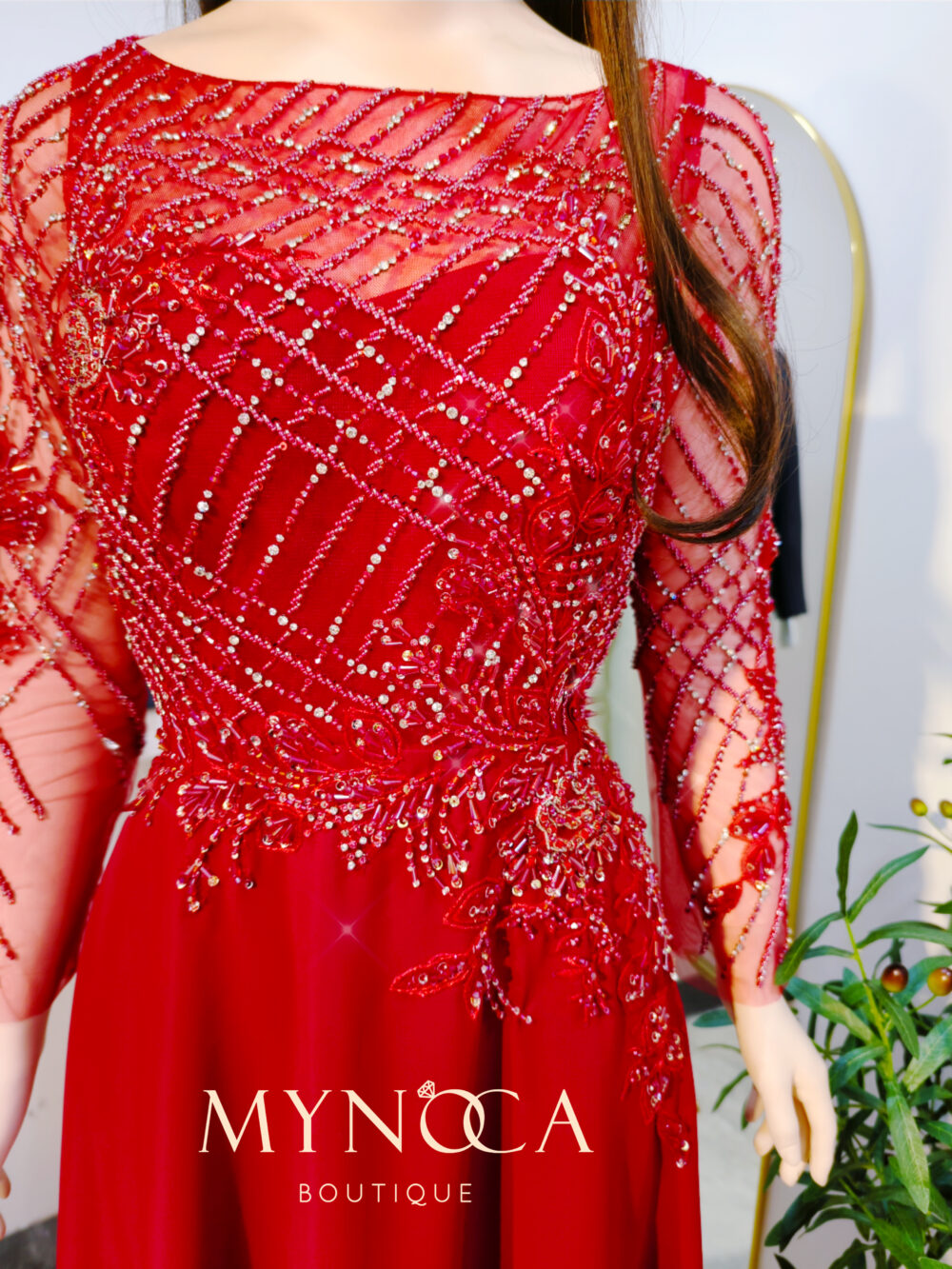 - Mẫu đầm dạ hội form dáng suông A nhẹ nhàng được thiết kế trên nền lưới đỏ đính kết caro cách điệu phần thân trên lệch trái một cách tinh tế.